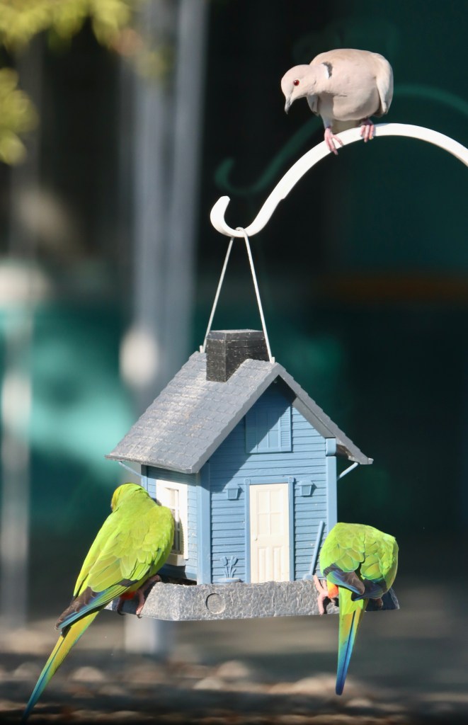 While I have several species that frequent the feeder (Blue Jay, Northern Mockingbird, American Cardinal, Red-winged Blackbird, Common Grackle, Mourning Dove, Eurasian Collared-Dove, and Eurasian Starling) all of them cede the space when the flock of Nanday Parakeets (Aratinga nenday) arrive.