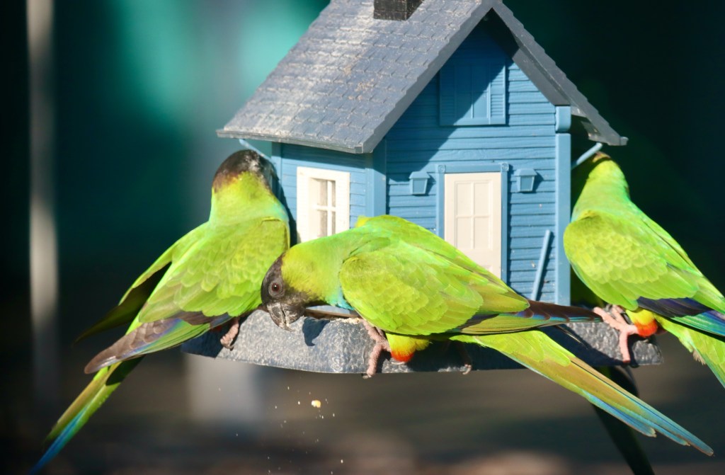 I view their afternoon arrival with mixed emotions. On the one hand, I enjoy watching these noisy and colorful, medium-sized parrots. On the other, I know my feeders will soon be empty.