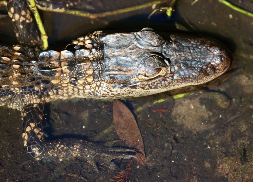 While strolling the boardwalk I noticed a juvenile alligator off to the side. The rule about baby gators is that momma is always nearby. I looked from side to side and all around before it finally occurred to me to look down.