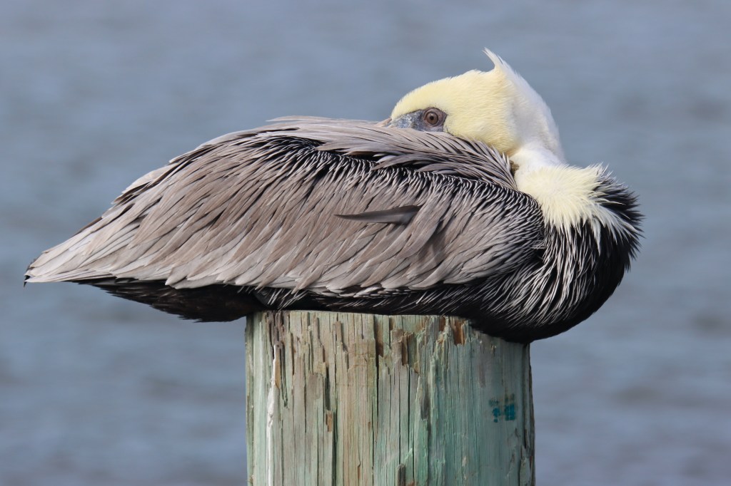 I spent some time photographing this Brown Pelican (Pelecanus occidentalis) at Anclote River Park last month. This adult (it is difficult to tell the genders apart, since coloration is similar with females being slightly smaller) was just beginning to prep for breeding season, hence the yellow head and reddish bill.