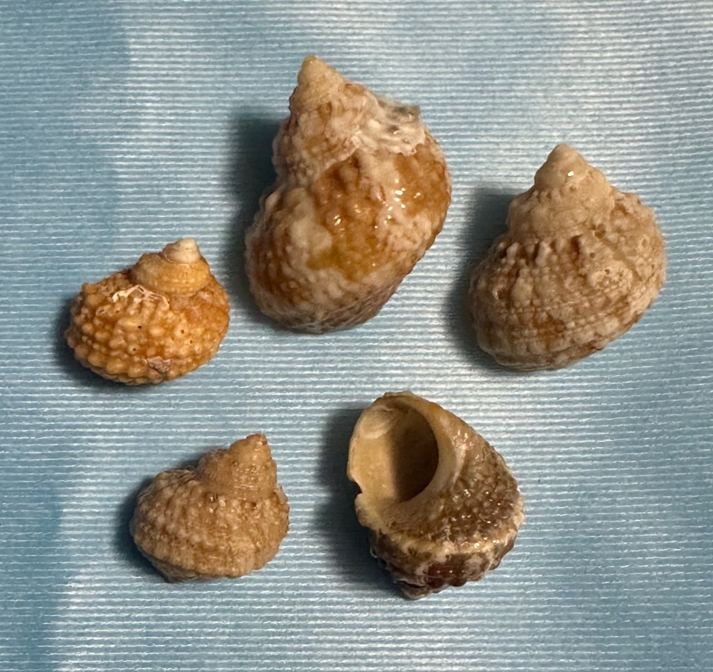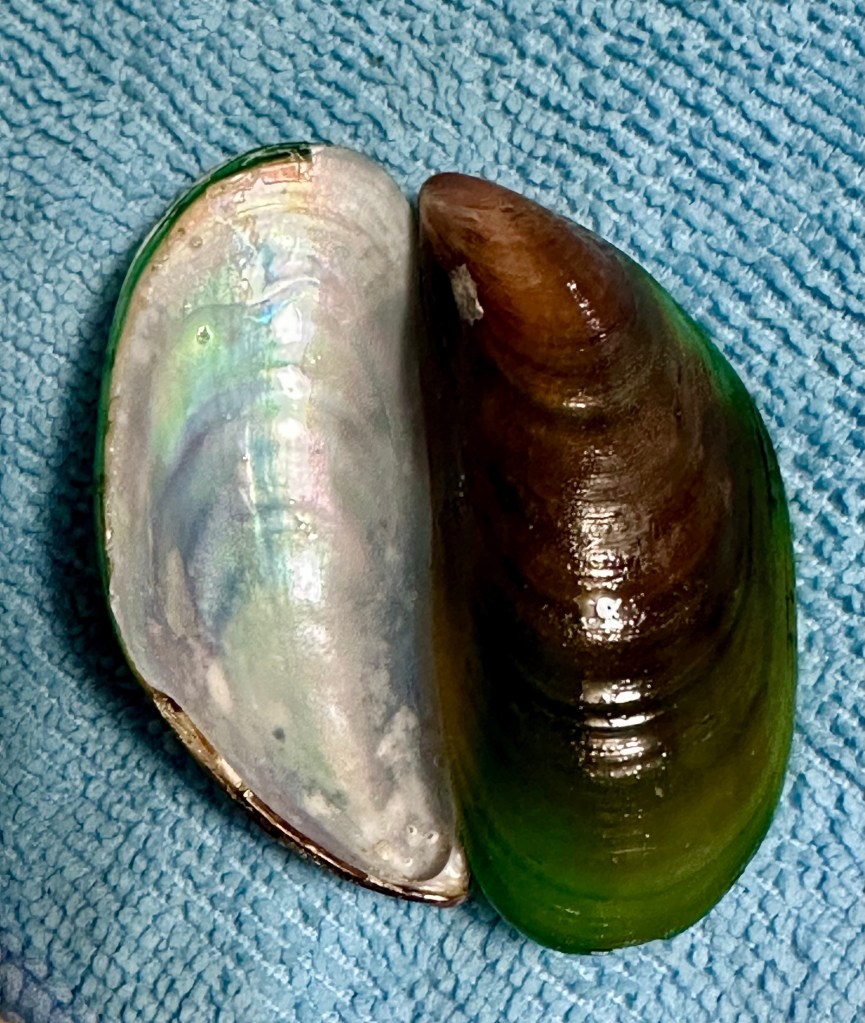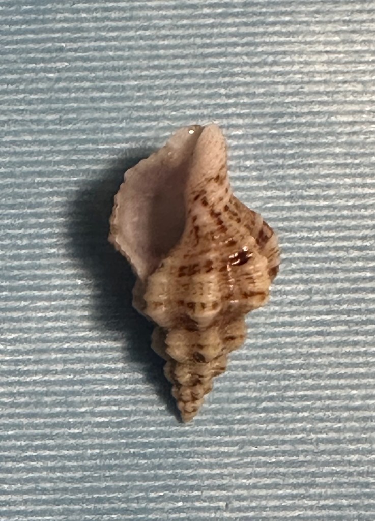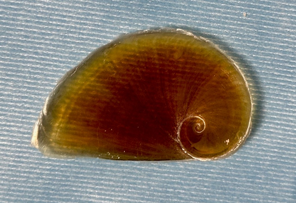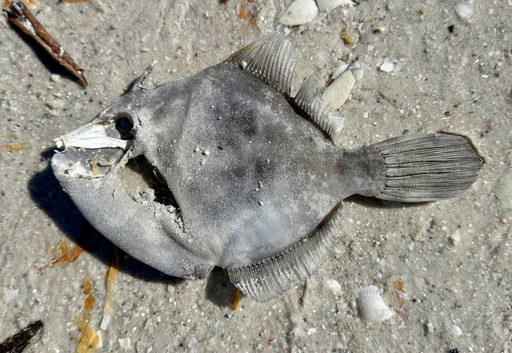 A quick internet search identified the flat, gray, and very dehydrated fish I found as a Planehead Filefish. I collected a few more Chestnut Turbans, Bubbles, and an Oyster Drill as they are rare on my beach. Came across the molt of a Flame Streak Box Crab, a new species for me. Since I had recently read about them, I knew that the green mussel shell, while colorful, was from an invasive species (at least it was dead).
