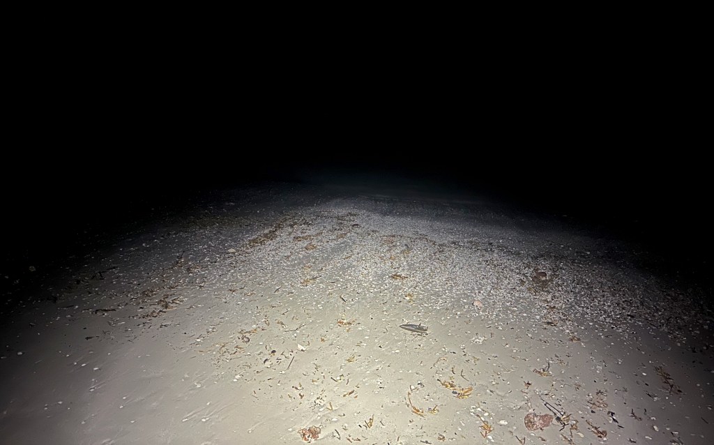 It was still dark and a breezy 47° but we didn’t let that stop us! We had our headlamps and wore multiple layers. Since I’m a complete cold weather wimp I even had on ear muffs and gloves. Believe it or not, we weren’t the only ones braving the elements, we could see other little dots of light up and down the beach.
