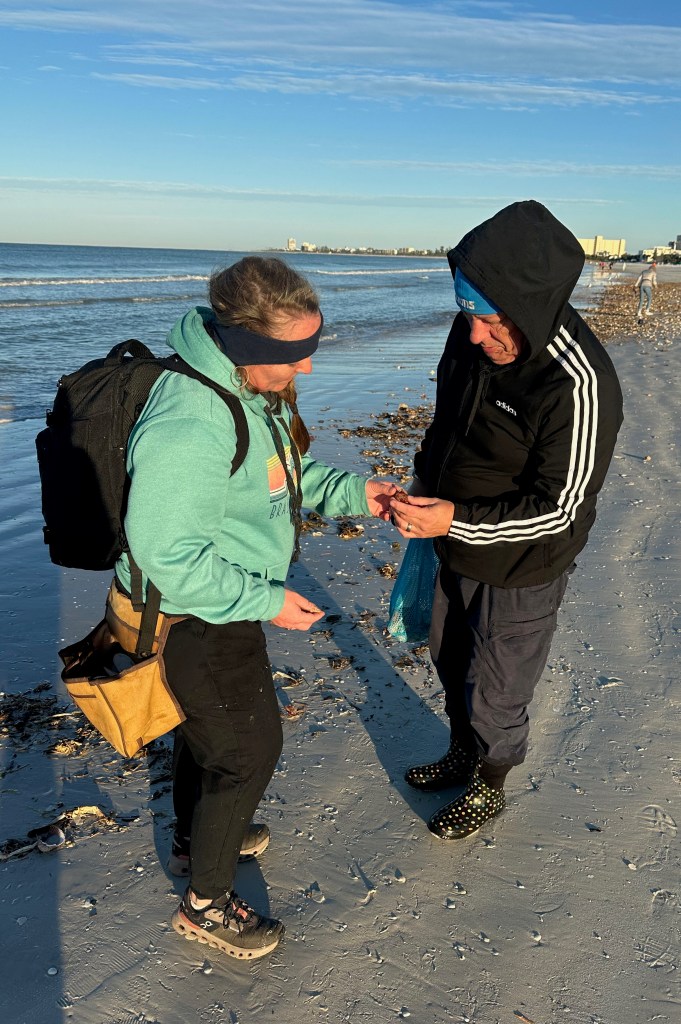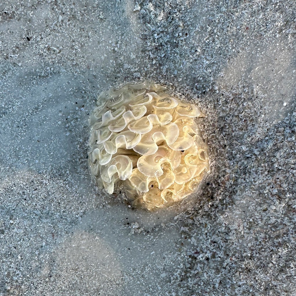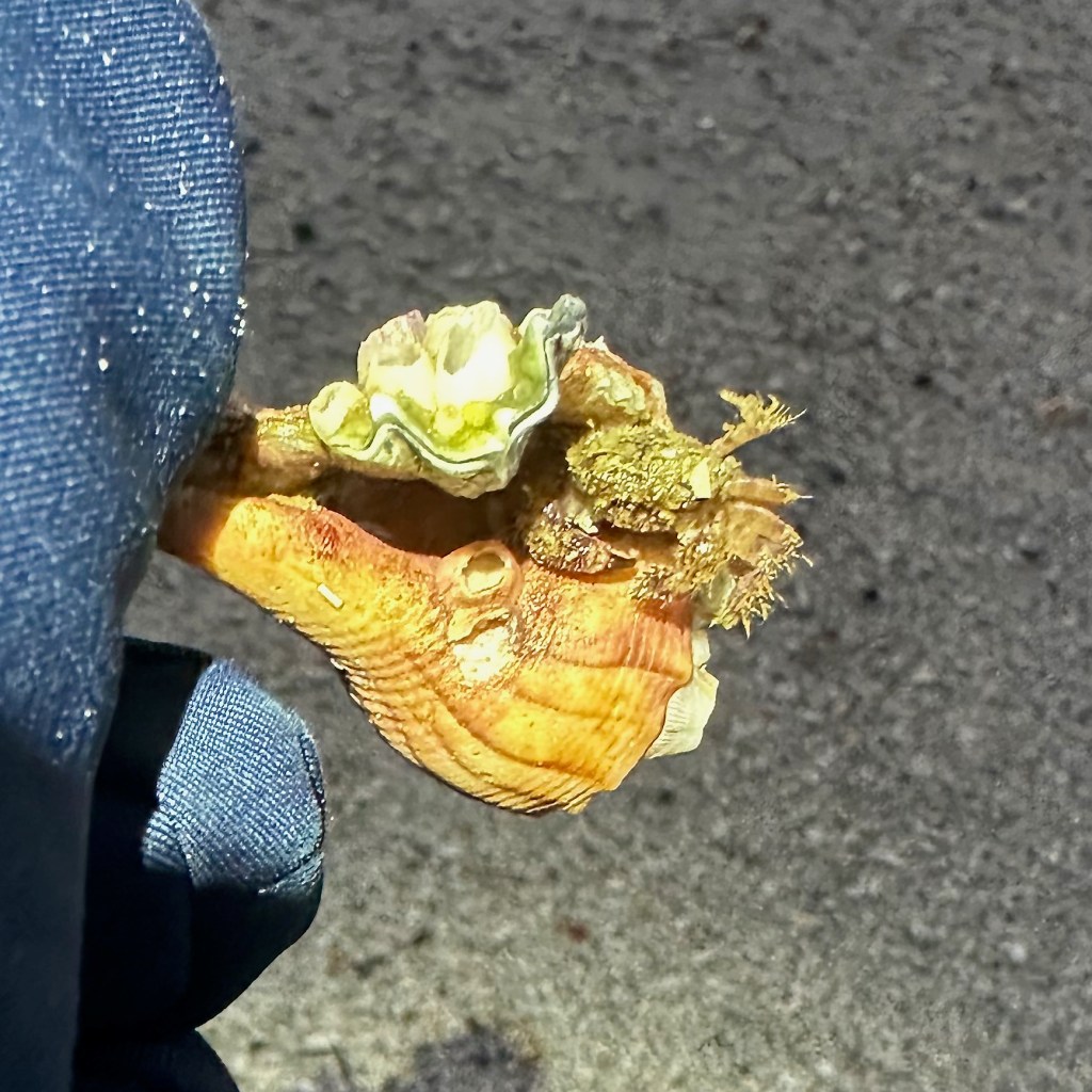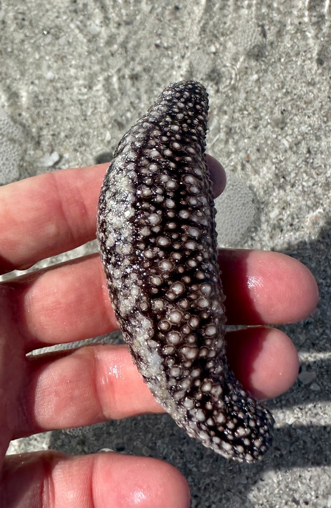 While the crowd had grown there was still so much to see. Interestingly, there were a lot of occupied shells, either by the original creator or by hermit crabs. We returned all the live ones we found to the gulf. Even had the chance to carefully untangle a Sea Cucumber from the wrack and slide it back into the water.