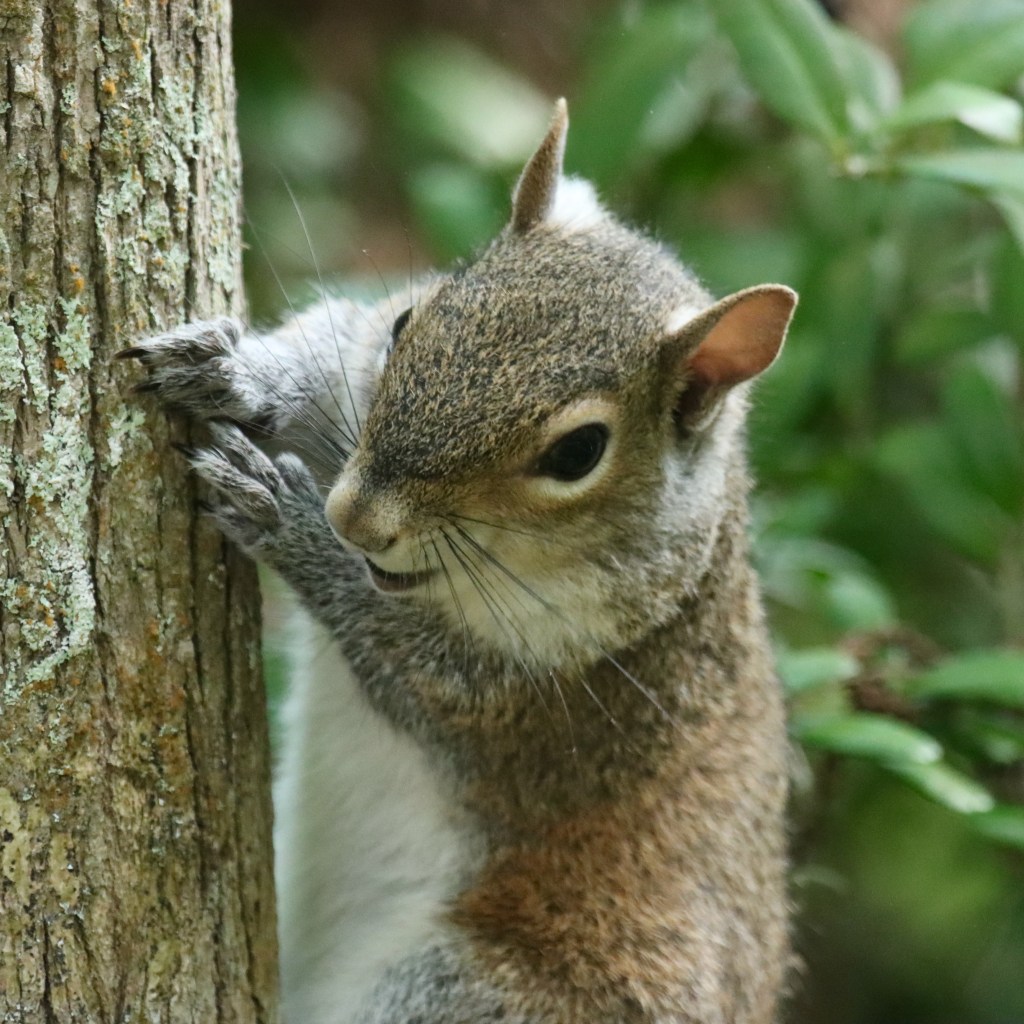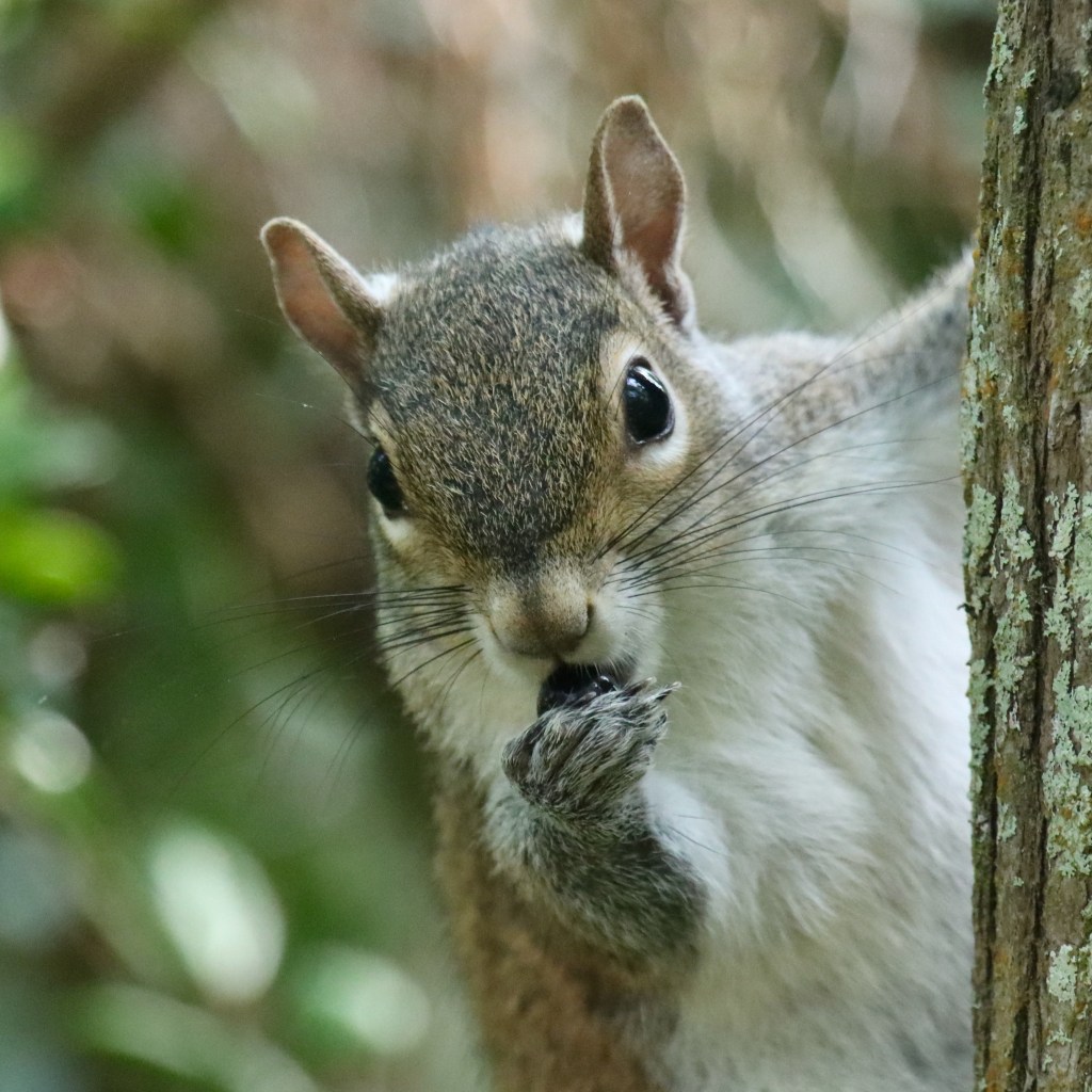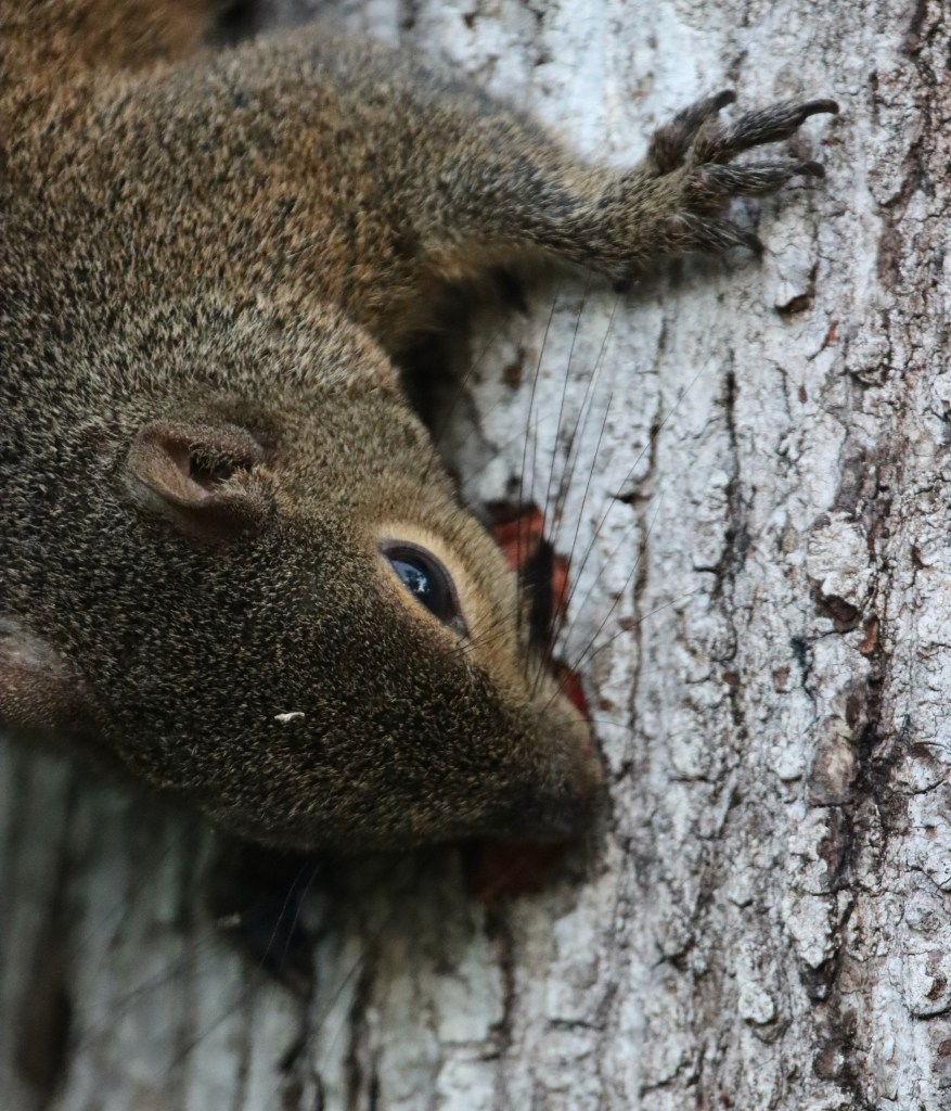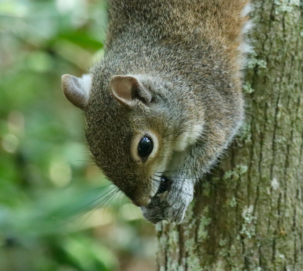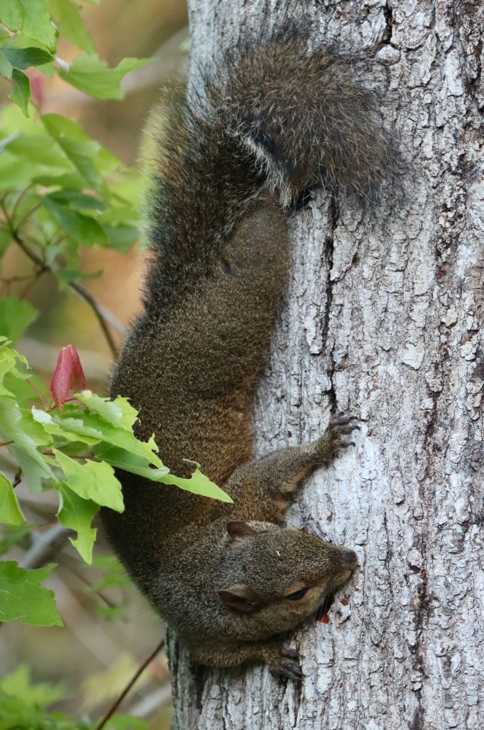 At Sawgrass Lake Park a noticeably large squirrel on a tree trunk caught my eye and its curious behavior drew me closer. The squirrel was intently gnawing the bark. After watching, I surmised that she was pregnant and was selectively chewing that section of bark for either the sap or insects inside, presumably needing extra nutrition for gestation.