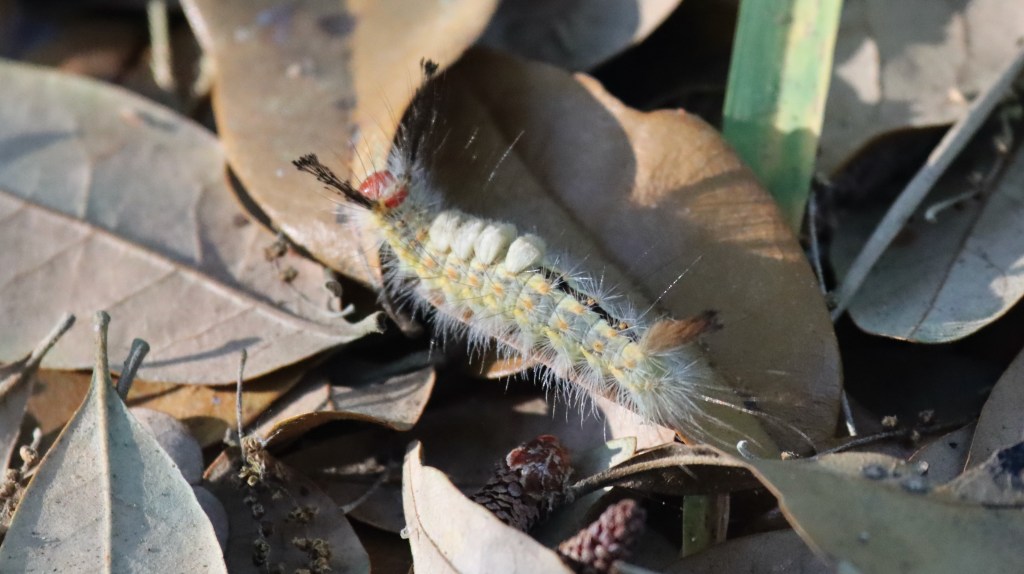 At John Chestnut Sr. Park I was captivated by a squirrel exerting great effort to harvest dried fruits from a bush. I still don’t know what kind of a bush it was but apparently, it produced delicious fruit. While strolling along the boardwalk I had to watch where I put my hands as the park was literally crawling with tussock moth caterpillars. They may look cute and fluffy but those fuzzy hairs are defensive. Reactions to touching them range from irritating to downright painful (and I was not interested in finding out).