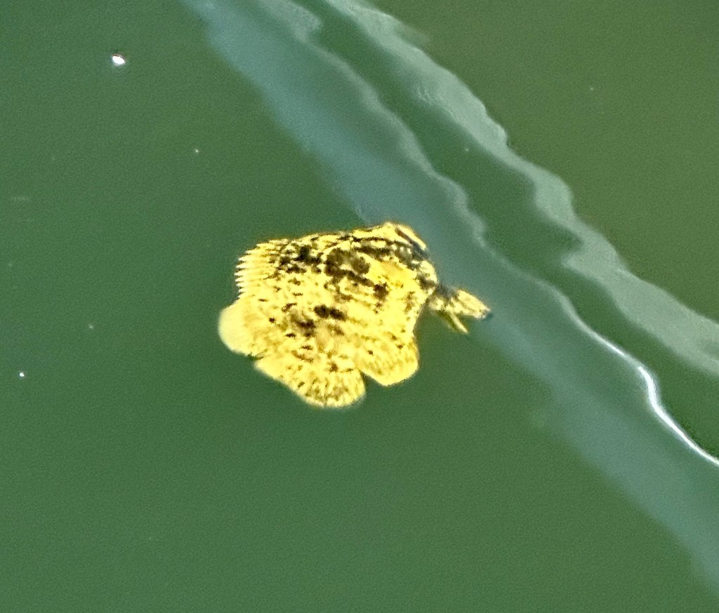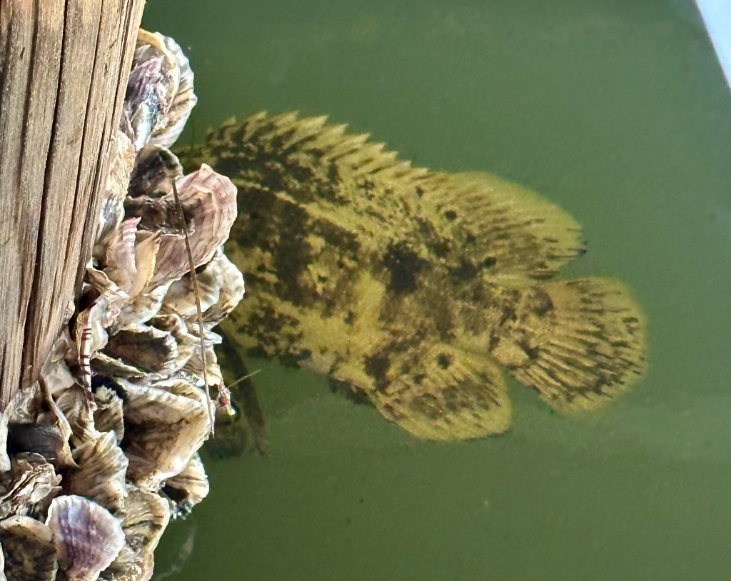 A few minutes later, we spotted a mother and baby manatee grazing on seagrass in the nearby shallows. It was a pleasant surprise because the water temperature has cooled off quite a bit recently, down to 68°. Cooler water temperatures usually sends manatees searching for warmer water, inland at springs or near power plant outflows. We enjoyed our snacks while watching them slowly bob up and down, another sight I will never tire of!