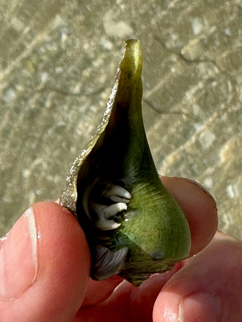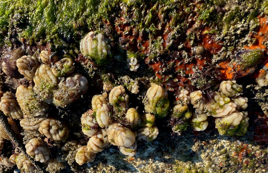 A very bold Great Blue Heron flew in to check out our find. The bird watched intently as I played with the Sea Squirts that were growing among the algae on the keel (see video below). True to their name, they will squirt stored water when disturbed – one of their defense mechanisms. After I moved aside, the heron tried eating one of them but they were firmly attached (another defense mechanism), so he moved on.