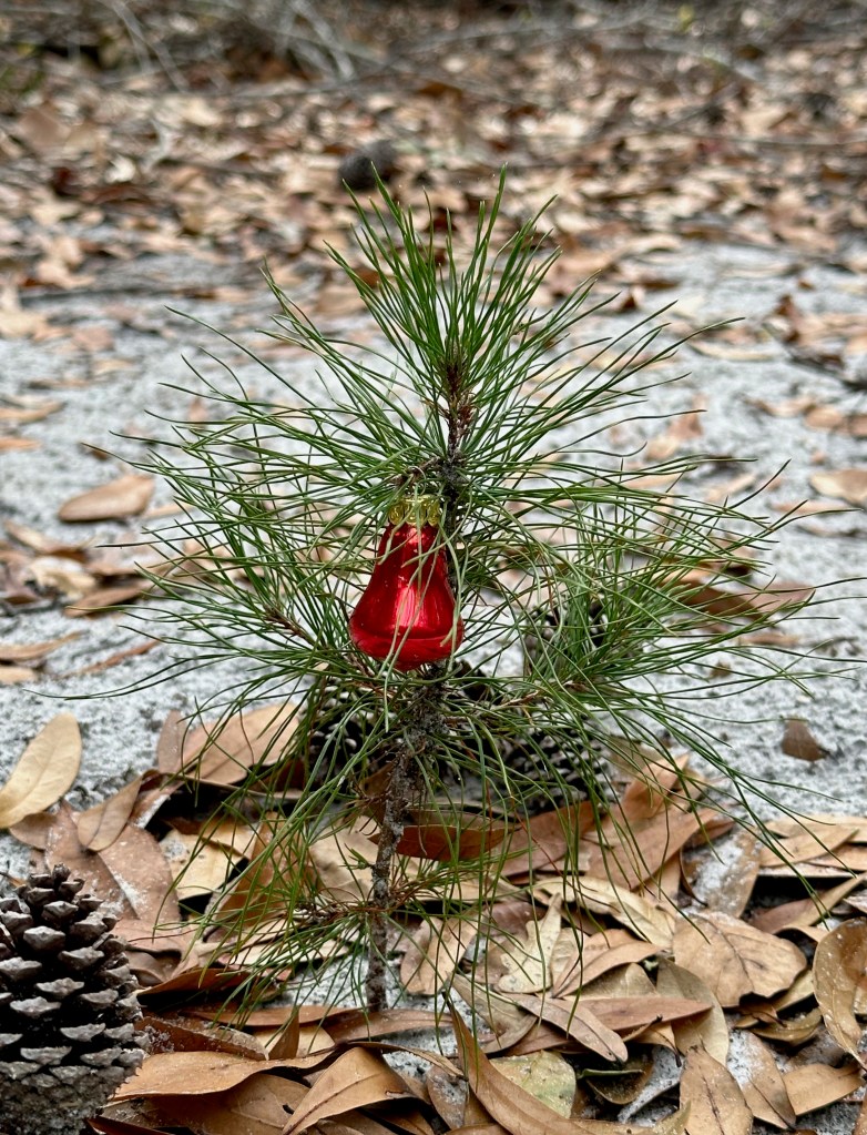 In a small clearing nearby I was treated to a sweet and simple sight, someone had decorated a pine seedling for the season. It made an adorable little Christmas tree. Whoever you are, thank you for the giving me a smile.