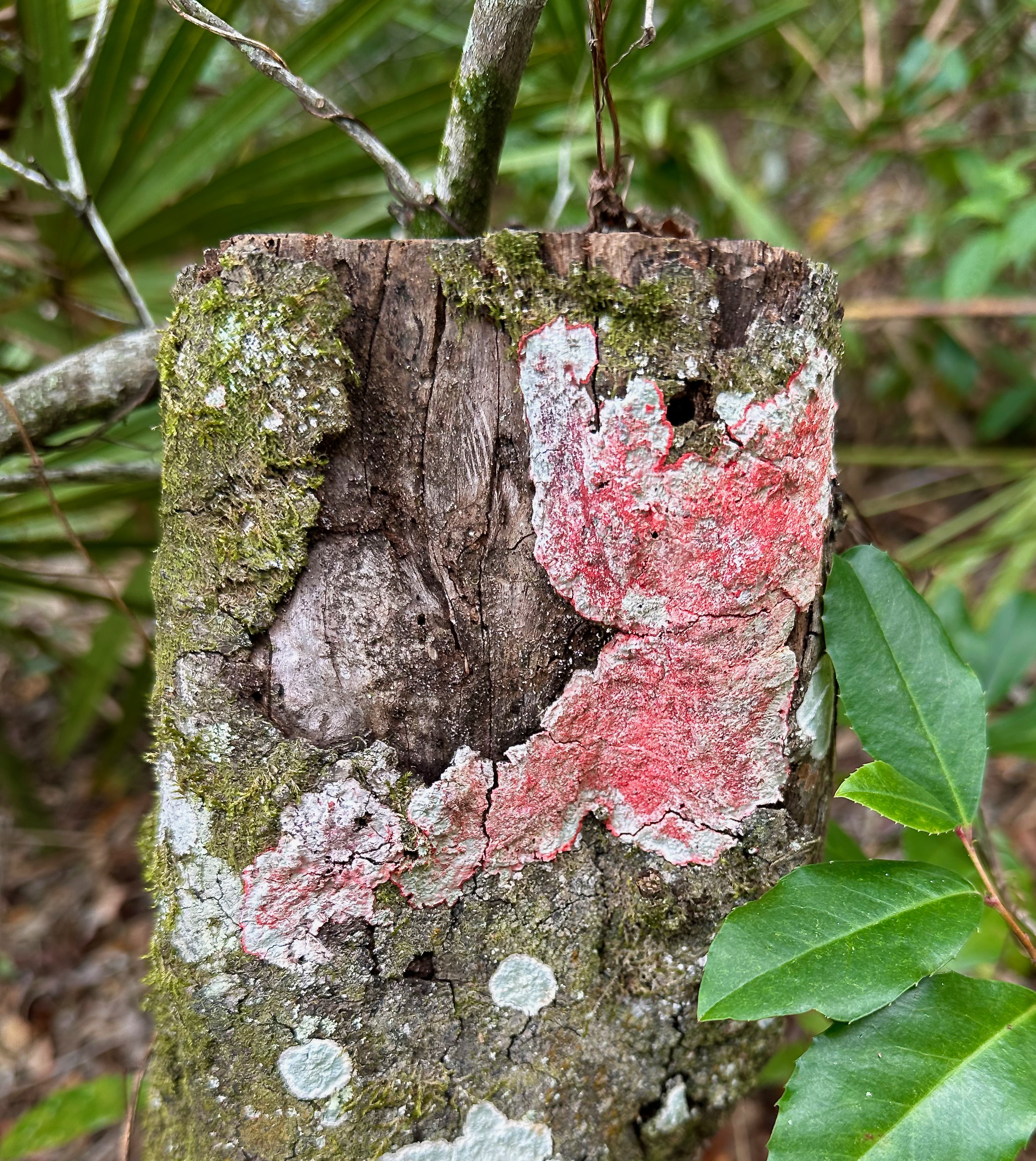 Turning around I spotted Christmas Wreath Lichen (Cryptothecia rubrocincta) growing on a tree trunk. The name is based on the color combination along with its typically round shape.